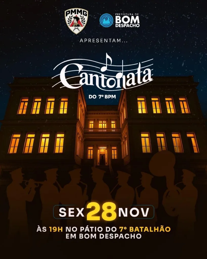 No próximo dia 28 de Novembro, o 7° Batalhão convida a população de Bom Despacho para participar de um dos espetáculos mais importantes da cultura de Bom Despacho. Trata-se dos Cantonatas, um evento que conta com arte dos cânticos locais e a apresentação da banda de música da unidade.