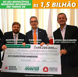 Cerca de R$ 1,5 bilhão será distribuído aos 853 municípios mineiros em três parcelas, sendo 40% até 31 de agosto, 30% até 31 de janeiro e outros 30% até 1º de julho de 2022.