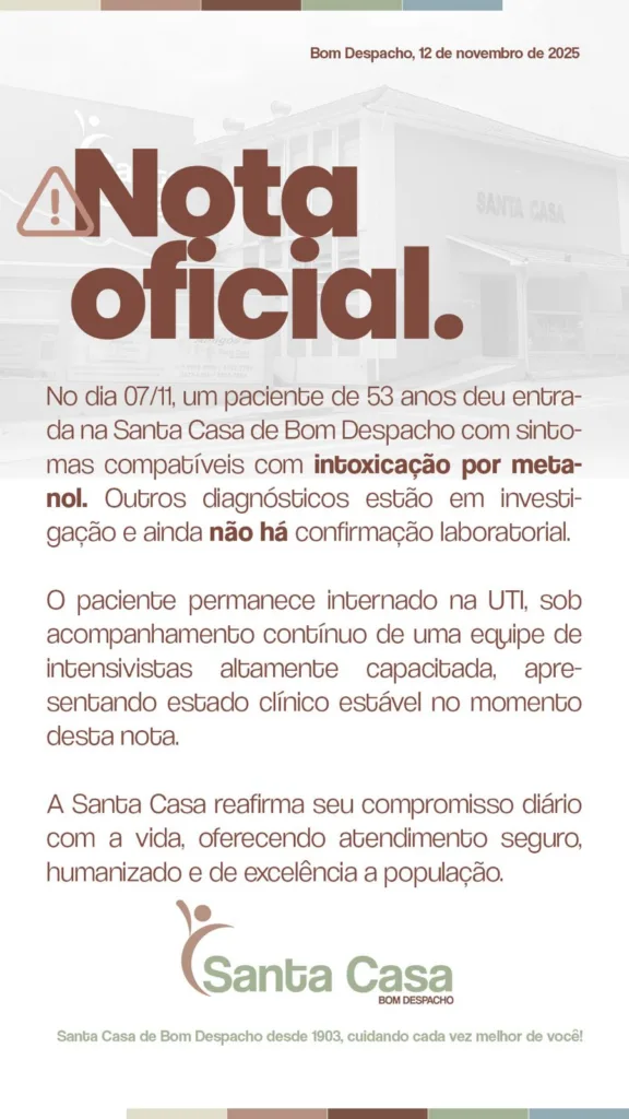No dia 07 de novembro, um homem de 53 anos entrou na Santa Casa de Bom Despacho com sintomas compatíveis com intoxicação por metanol. Porém, não há confirmação laboratorial que comprove a suspeita do caso.