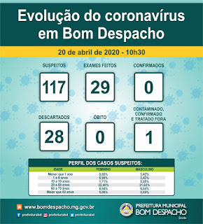 Até o momento, Bom Despacho não registra caso confirmado de Coronavírus na cidade. Há 117 casos suspeitos, sendo 28 descartados dos 29 exames feitos. O município também não registrou nenhuma morte suspeita ou confirmada de Covid-19.