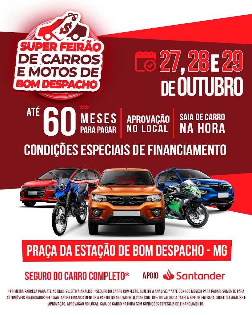 Vale destacar que o Feirao de Veículos de Bom Despacho tem o apoio do Banco Santander e Prefeitura Municipal de Bom Despacho. “Serão oferecidas ao público presente, taxas diferenciadas de financiamento e aprovação imediata mediante a análise de crédito com a primeira parcela a ser paga após 45 dias”, informou Borges.