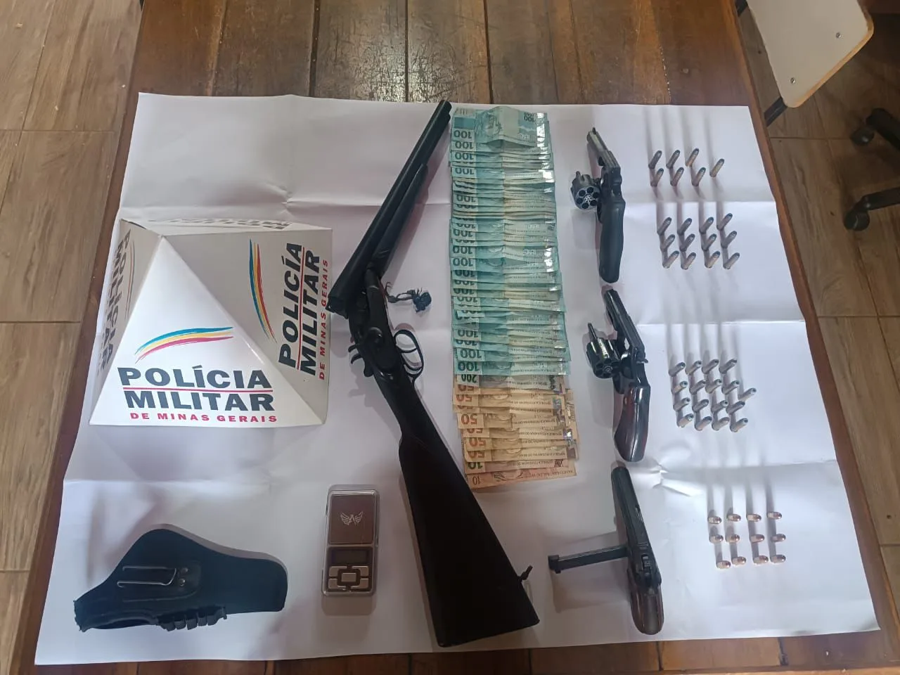 Logo depois, em um outro local, também foram apreendidas uma espingarda calibre 12, um revólver calibre .38 da marca Taurus e mais 22 munições do mesmo calibre, além de dois pássaros da fauna silvestre, e mais um homem de 44 anos foi preso.