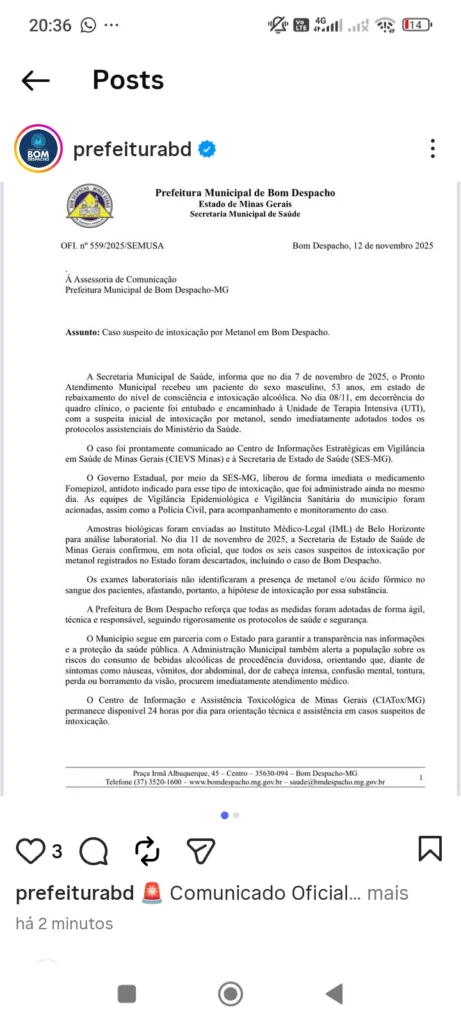Conforme a Nota de Esclarecimento publicada no Instagram da Prefeitura de BD, ‘amostras biológicas foram enviadas ao Instituto Médico-Legal (IML) de Belo Horizonte para análise laboratorial. No dia 11 de novembro de 2025, a Secretaria de Estado de Saúde de Minas Gerais confirmou através de nota oficial que todos os seis casos suspeitos de intoxicação por