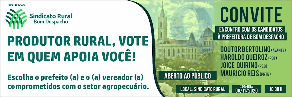 Na próxima sexta-feira, dia 06 de novembro, o Sindicato Rural de Bom Despacho promove um encontro de produtores rurais com os candidatos a Prefeito da cidade. O evento irá atender ao protocolo de distanciamento do Covid 19.