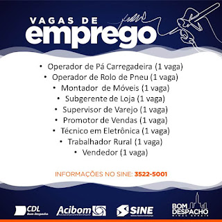O Sistema Nacional de Emprego (SINE) anuncia que está 19 vagas de trabalho em Bom Despacho. Há oportunidades para trabalhar nos setores de prestação de serviços, transporte e comércio.